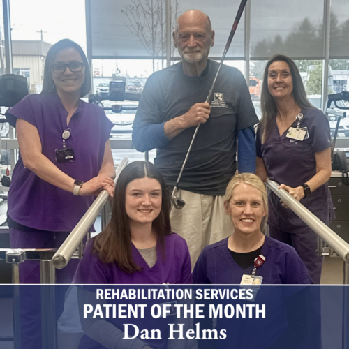 Daniel (Dan) Helms is the March 2026 Rehabilitation Services Patient of the Month. He was nominated by his team of therapists: Heather Riga (Speech Therapy), Ladine Lipinski (Occupational Therapy), Carly Evers (Occupational Therapy), and Emily Schmid (Physical Therapy).