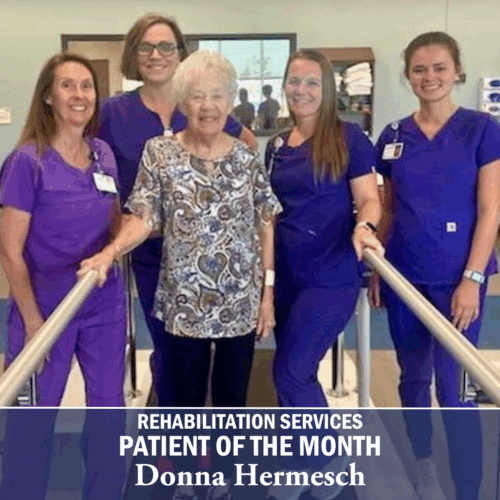 DCMH Rehabilitation Services is proud to recognize Donna Hermesch as our August Patient of the Month. Donna is currently receiving Physical Therapy, Occupational Therapy, Speech Therapy, and Cardiac Rehab at our Rehabilitation & Medical Offices building. She was nominated by her care team Ladine Lipinski (OT), Heather Riga (ST), Holly Koors (PT), and Gabi Elston (CR) for her hard work, determination, and positive attitude.
